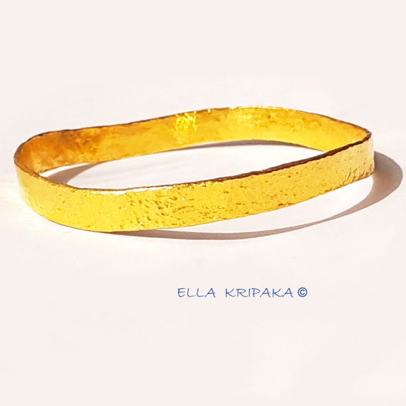 Fine Gold Bangle Bracelet Uneven is made of solid gold 24 k. I use 100% handmade jewelry technology of Ancient Rome with Fine Arts to create this gold jewelry. I do the handmade technique for each item of my jewelry. Every item of my gold jewelry I begin with my own design drawings with pencils and watercolors. Then I do the technique of manual cutting, sawing and manual welding for gold. I do forging and hammering of jewelry for art texture of gold. The gold jewelry is hammered. The bracelet is hand polished, it is with shiny surfaces of gold. I make the connection of parts with 24k gold & due to this reason, the jewelry is with thicker hammered gold in this place. I make very high hardness of the 24 k gold jewelry especially.