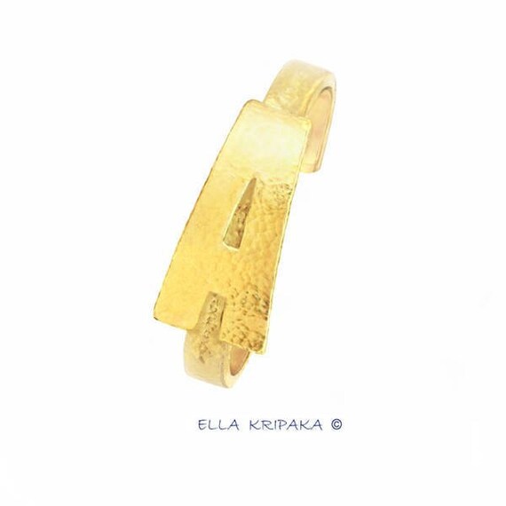 Fine Gold Bracelet Cuff Hammered Alphabet Monogram Initial is made of solid yellow gold 18 K. Wonderful fine gold gold bracelet is handmade by me with Arts. I use ancient jewelry technology of the Ancient Rome with Fine Arts. I do handmade technique for each item of my jewelry. Every item of my gold jewelry I begin with my own design drawings with pencils and water colors. Then I do the technique of manual cutting, sawing and manual welding for gold. I do forging and hammering of jewelry for art texture of gold. The bracelet is hand polished, it has shine. The jewelry is very hammered. Gold bracelet is hollow inside with folded borders for strong design. Finished jewelry will be quite a bit different from the images because of handmade. All copyrights are reserved.
