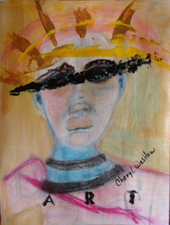 This is an Original abstract modern contemporary outsider portrait, figurative drawing/mixed media painting of a woman's face.