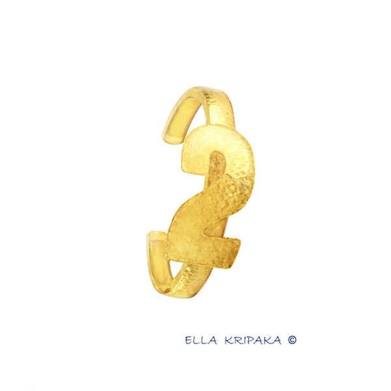 Fine Gold Bracelet Cuff Hammered Individual Personalized Number is made of solid yellow gold 18 K. Wonderful fine gold gold bracelet is handmade by me with Arts. I use ancient jewelry technology of the Ancient Rome with Fine Arts. I do handmade technique for each item of my jewelry. Every item of my gold jewelry I begin with my own design drawings with pencils and water colors. Then I do the technique of manual cutting, sawing and manual welding for gold. I do forging and hammering of jewelry for art texture of gold. The bracelet is hand polished, it has shine. The jewelry is very hammered. Gold bracelet is hollow inside with folded borders for strong design. Finished jewelry will be quite a bit different from the images because of handmade. All copyrights are reserved.