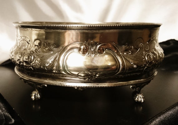The rim has a reeded top border, there is an all over heavily engraved design of scrolling foliate and flowers and decorative chunky lion paw feet, there is a central cartouche surrounded by scrolls and this has not been engraved or monogrammed so could be personalised if desired.