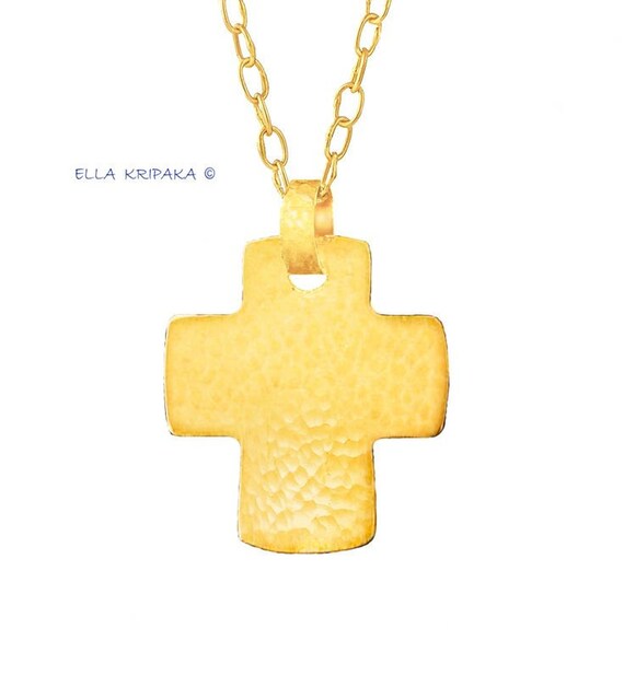 Fine Gold Pendant 22k Byzantine Empire Cross Convex Hammered is made of solid yellow gold 22 k. I use 100% handmade jewelry technology as in the Byzantine Empire with Fine Arts. Creative works for gold jewelry I begin with my own design drawings with pencils and watercolors. Then I do the technique of manual cutting, sawing and manual welding for gold. I do forging and hammering of jewelry for art texture of gold. Hammered reliefs always shine on 24k gold with many golds reflects. The pendant is hand polished, hammered gold jewelry always shines with many bright reflects. I make very high hardness of the 22 k gold jewelry especially. Finished jewelry will be quite a bit different from the images because of handmade. All copyrights are reserved.