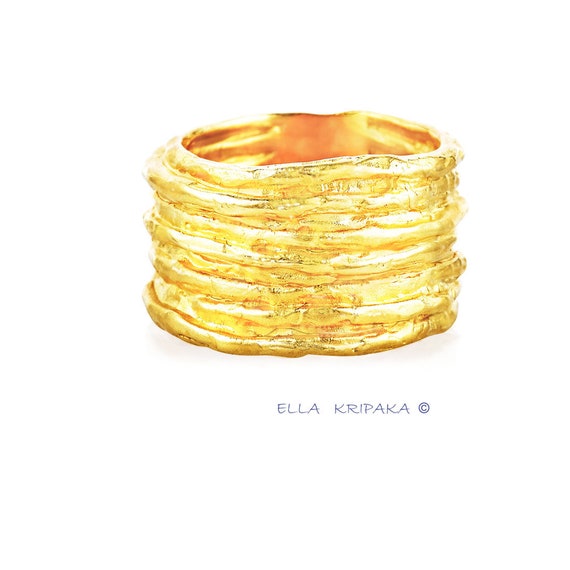 Fine Gold Ring Uneven Convex Shiny Sizable Organic Hammered, also it can be Wedding Band, the ring is made in solid gold 22 k. I use 100% handmade jewelry technology of Ancient Rome with Fine Arts to create this gold jewelry. I do the handmade technique for each item of my jewelry. Every item of my gold jewelry I begin with my own design drawings with pencils and watercolors. Then I do the technique of manual cutting, sawing and manual welding for gold. I do forging and hammering of jewelry for art texture of gold. The gold jewelry is hammered. The ring is hand polished, it is with shiny surfaces of gold. Borders are folded, beautiful design is convex, the ring is hollow inside with uneven forged borders, every jewelry is without copies. I make the very high hardness of the 22 k gold jewelry especially. Finished jewelry will be quite a bit different from the images because of handmade. All copyrights are reserved.