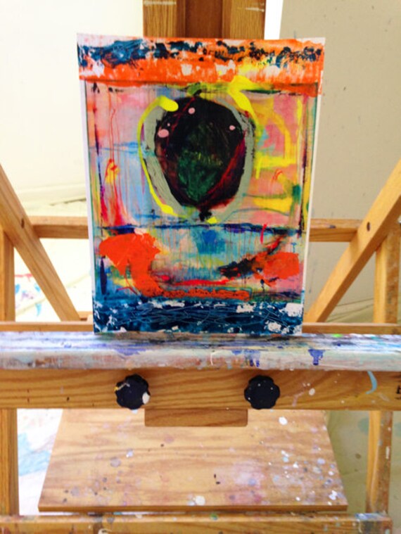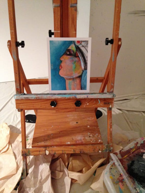 original painting, on paper, acrylic drawing, of woman, head, figurative art, portrait, contemporary face, art red turquoise, pen and ink 9 x 12
