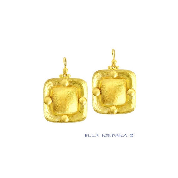 Fine Gold Square Dome Hammered Earrings as in the Ancient Rome are made of solid yellow gold 22 K. I create my own design of jewelry in gold. Wonderful solid gold earrings are handmade by me. I use ancient jewelry technology with Fine Arts. I do handmade technique for each item of my jewelry. Every item of my gold jewelry I begin with my own design drawings with pencils and water colors. Then I do the technique of manual cutting, sawing and manual welding for gold. I do forging and hammering of jewelry for art texture of gold. I make good long length of clasps for the best comfortable clasps for buyers according to the form of their ears. The earrings are hand polished, they have shine. My gold jewelry has hardness, I specially make this for gold. Finished jewelry will be quite a bit different from the images because of handmade. All copyrights are reserved.